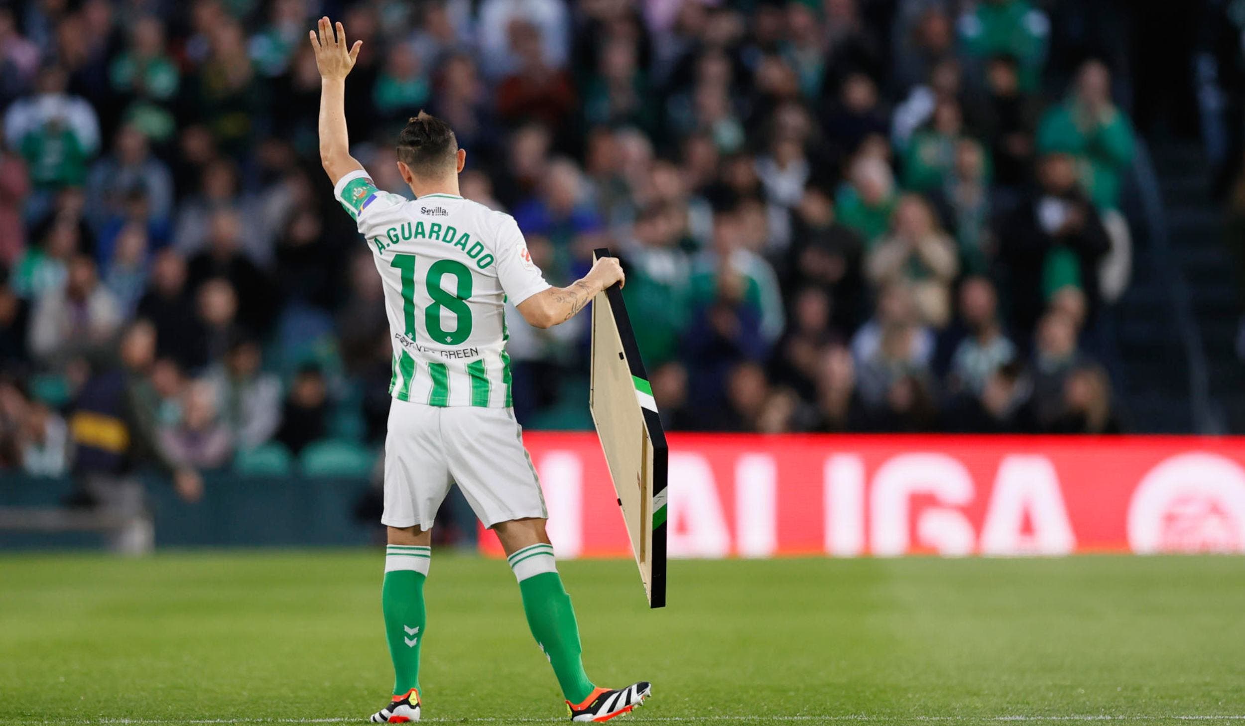 Los más de cincuenta mil béticos que este domingo se han dado cita en el Benito Villamarín para el partido entre el Betis y el Barcelona han rendido tributo y homenaje a uno de los suyos, el mexicano Andrés Guardado, quien ha fichado por el Club León de su país tras siete temporadas en el club verdiblanco.