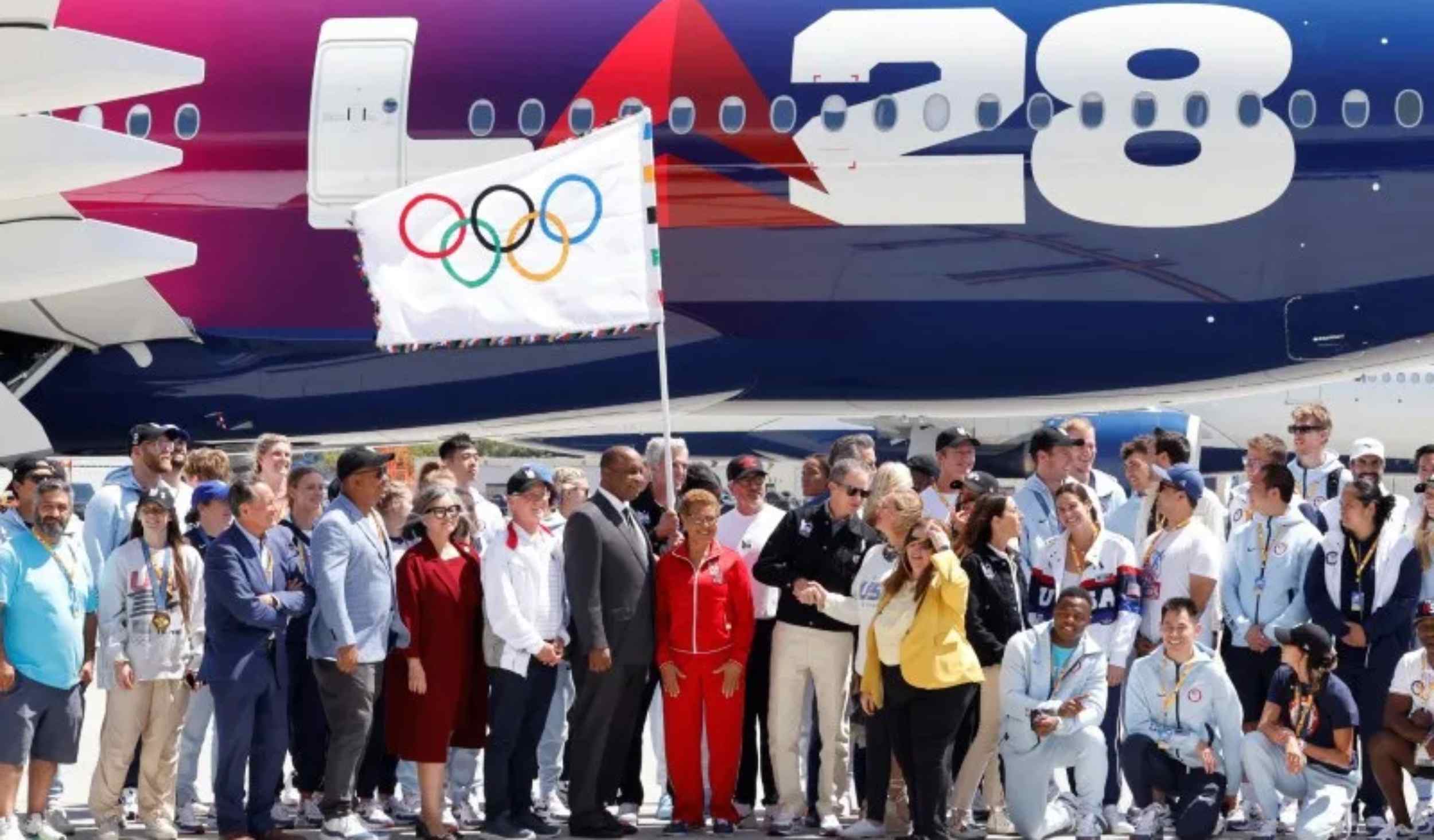 La alcaldesa de la ciudad angelina, Karen Bass, ondeó la bandera con los cinco aros olímpicos a su llegada al aeropuerto de Los Ángeles (LAX) junto a varios atletas estadounidenses, tras recoger el domingo el testigo de sede olímpica en la ceremonia de clausura de los Juegos de París.