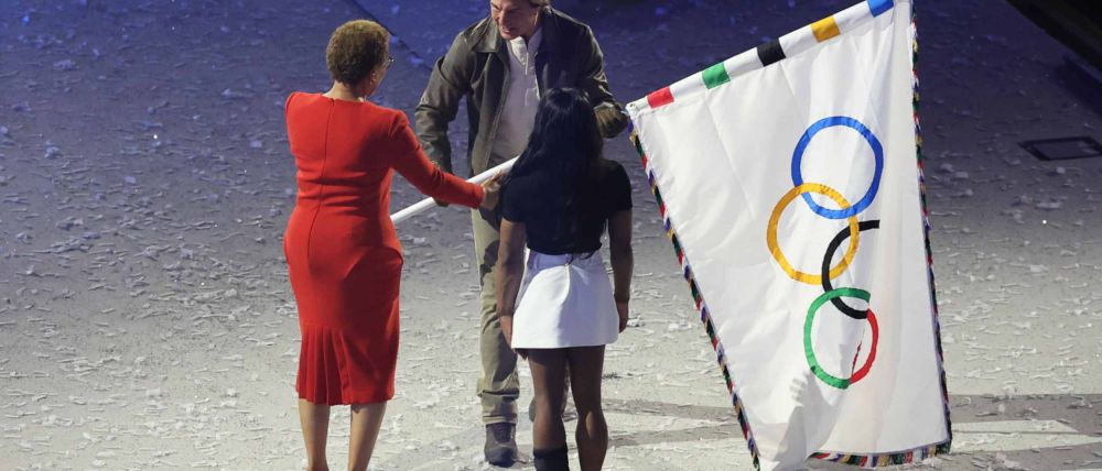 La alcaldesa de París, Anne Hidalgo, entregó la enseña olímpica a Thomas Bach y éste se la cedió a Karen Bass.