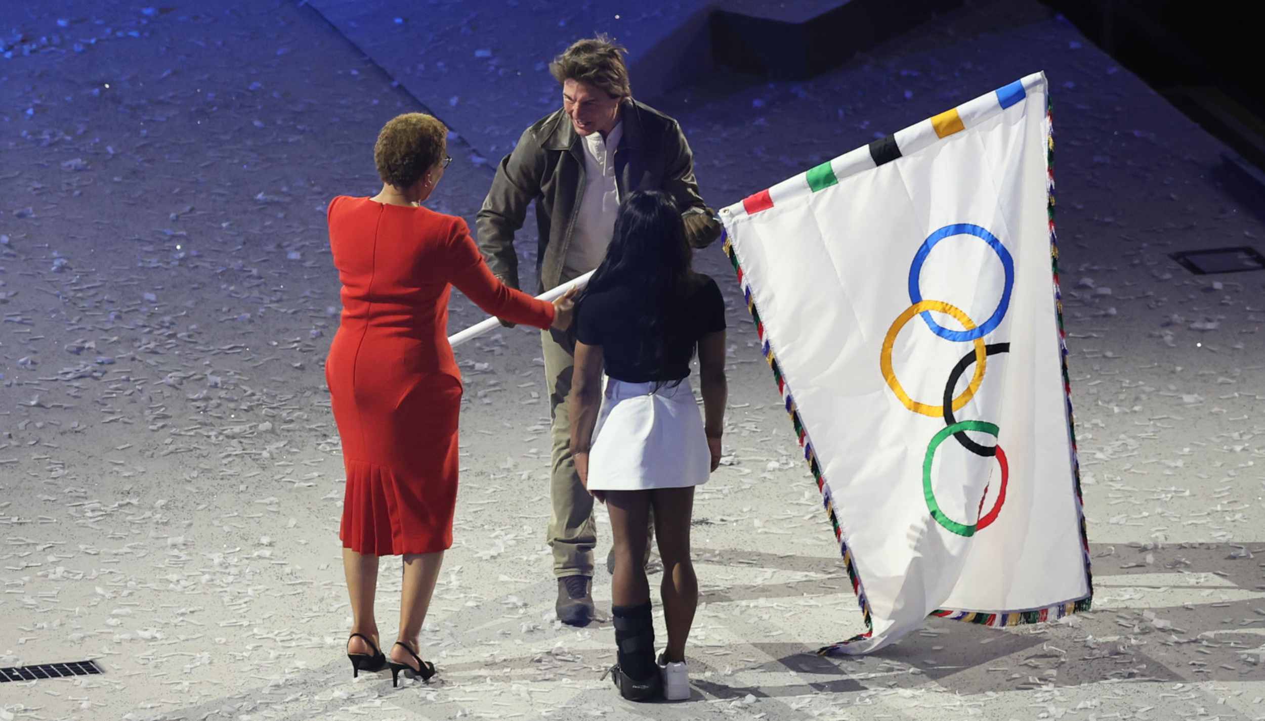 La alcaldesa de París, Anne Hidalgo, entregó la enseña olímpica a Thomas Bach y éste se la cedió a Karen Bass.