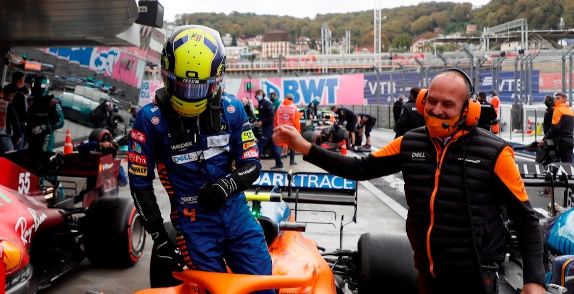 El madrileño firmó su mejor resultado en clasificación; Norris amplió el dulce momento que atraviesa McLaren tras su doblete en Italia con el triunfo del australiano Daniel Ricciardo, y Hamilton, que saldrá cuarto, tendrá que remar en la carrera prevista en seco este domingo para rentabilizar la penalización de Verstappen.