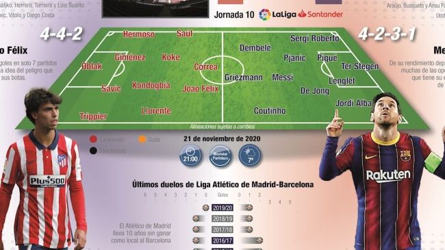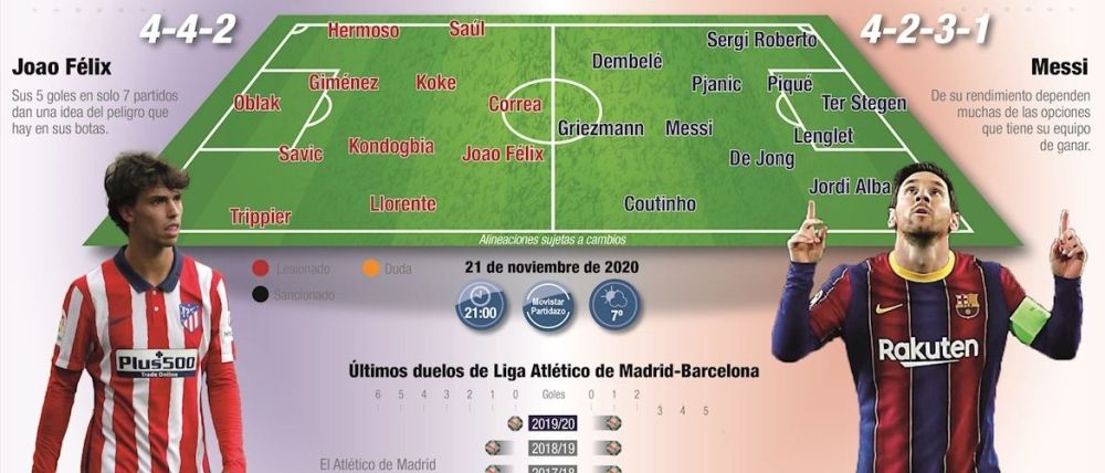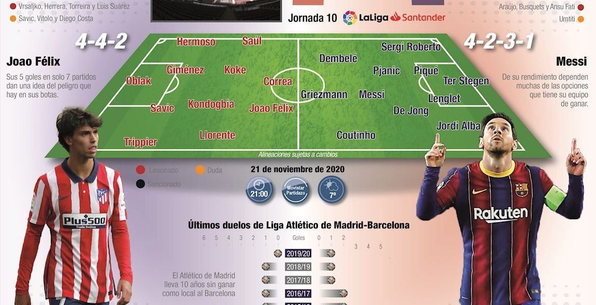 Madrid, 20 nov (EFE).- El Atlético de Madrid-Barcelona de este sábado en el estadio Wanda Metropolitano a través de 22 números:
