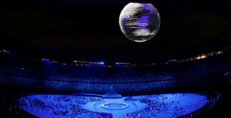Mil 824 drones formaron desde el centro del Estadio Olímpico el emblema de los Juegos en color azul índigo, tonalidad tradicionalmente usada en el archipiélago japonés y se elevaron a la noche tokiota hasta formar un globo terráqueo al son de "Imagine".
