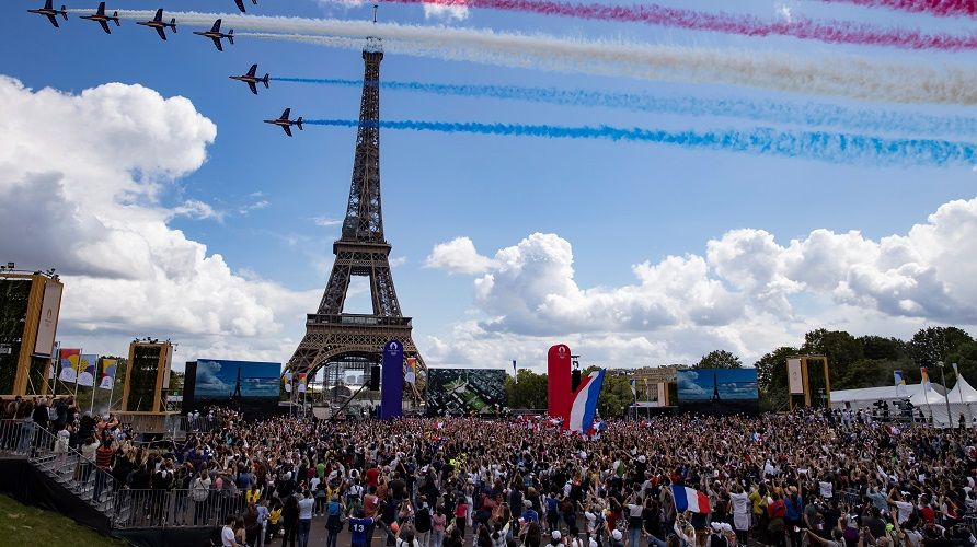 Tokio conectó después en directo con París, donde las cámaras ubicadas frente a la Torre Eiffel mostraron a una multitud celebrando la cuenta atrás para los próximos Juegos Olímpicos mientras la unidad de vuelo acrobático del ejército francés, la Patrouille de France, dibujó la bandera nacional en el cielo.