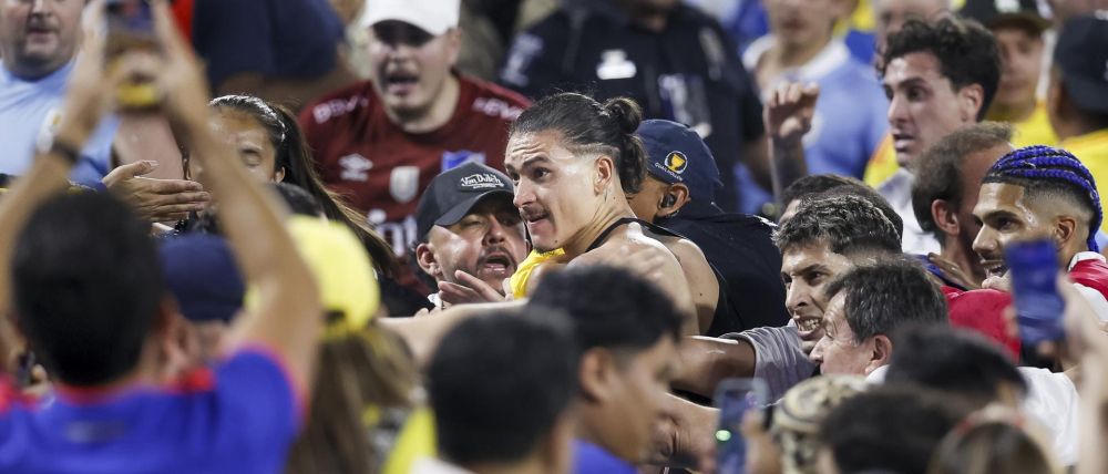 Al final del partido entre Uruguay y Colombia, varios jugadores uruguayos, entre ellos Darwin Núñez, Ronald Araújo y José María Giménez, se metieron a la grada a pelear con hinchas colombianos.