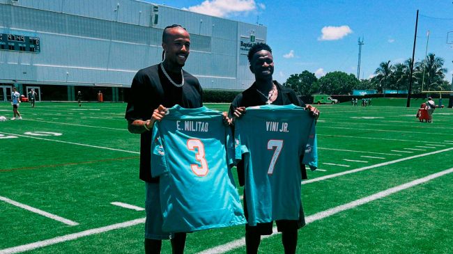 En el vestuario, ambos brasileños vistieron su jersey de Dolphins y Vinicius se puso un casco del equipo, unos guantes y tomó un balón de fútbol americano para probar suerte como corredor.