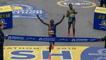 Arena deportiva Lawrence Cherono derrota al bicampeón del Maratón de Boston Lelisa Desisa Imagen Archivo