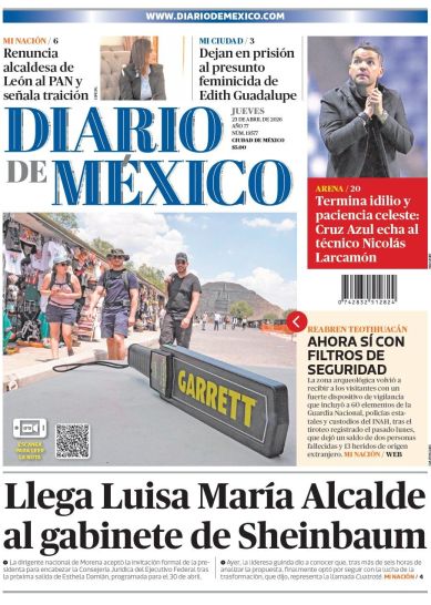 El 📰 Diario de México destaca la llegada de Luisa María Alcalde al gabinete de Sheinbaum para encabezar la Consejería Jurídica. También informa la reapertura de Teotihuacán con estrictos filtros de seguridad, la prisión preventiva al presunto feminicida de Edith Guadalupe, la renuncia de la alcaldesa de León al PAN, y en deportes, la salida del técnico Nicolás Larcamón de Cruz Azul.
