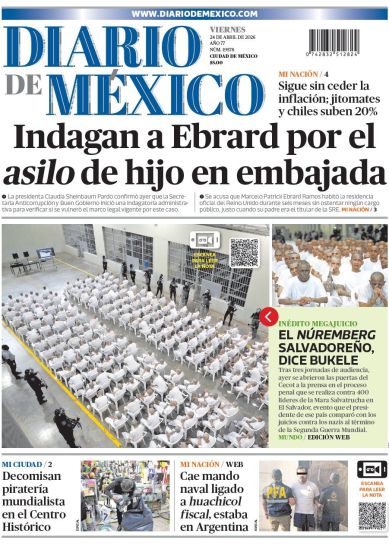 En su portada, el 📰 Diario de México informa que Marcelo Ebrard es investigado por el presunto asilo de su hijo en una embajada, mientras persiste la inflación con alzas de hasta 20% en jitomate y chiles. También destaca el megajuicio contra pandillas en El Salvador, el decomiso de mercancía pirata mundialista en el Centro Histórico, y la captura en Argentina de un mando naval ligado al huachicol fiscal.