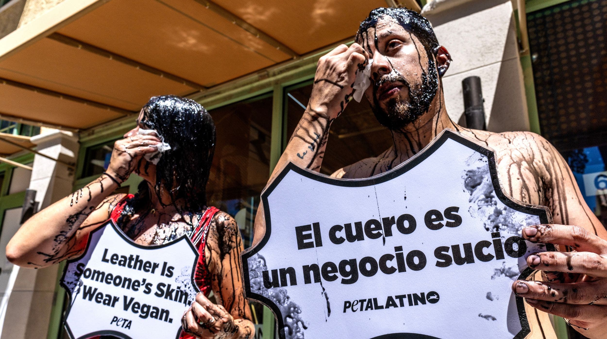 Activistas en EU se ponen ‘lodo negro’ contra el uso del cuero en la moda