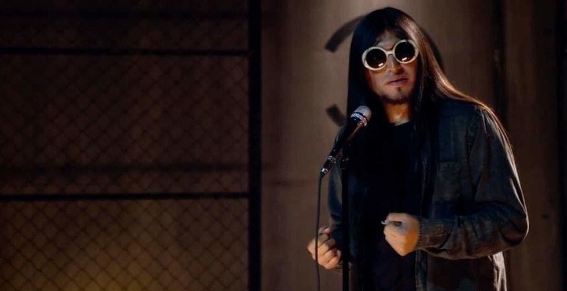 El transgresor aspecto de metalero: lacia melena a media espalda y uñas pintadas de negro, parece más el de un headbanger que el de un comediante admirador confeso del grunge y, sobre todo, de su ídolo omnipresente, Kurt Cobain, a quien rinde tributo con el uso de suéteres o jerseys a rayas y excéntricas gafas similares a las del desaparecido líder de Nirvana, la banda que electrificó una adolescencia modesta en su natal Chicoloapan, municipio del Estado de México.