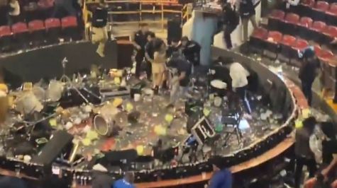 La tensión escaló rápidamente: se lanzaron sillas, vasos de cerveza y otros objetos hacia el escenario, obligando al equipo de seguridad a intervenir para proteger al cantante y su banda.