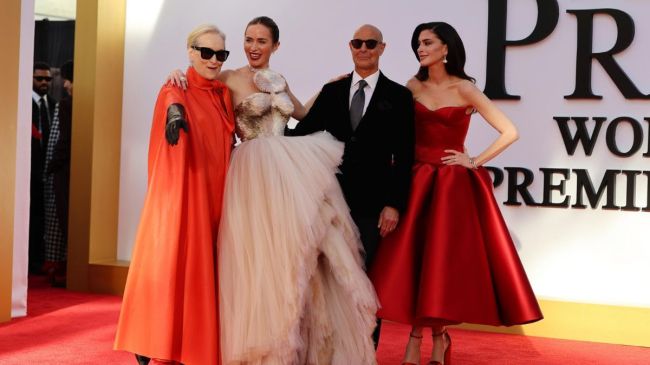Emily Blunt, la inolvidable asistente veterana, optó por un vestido de tono claro y aire romántico, donde las cascadas de tul superpuestas aportaron una textura etérea a su paso por la alfombra. Stanley Tucci, el carismático director de moda, completó el cuadro principal con un traje oscuro clásico y una elegante chaqueta de terciopelo, manteniendo la distinción que caracteriza a su personaje.