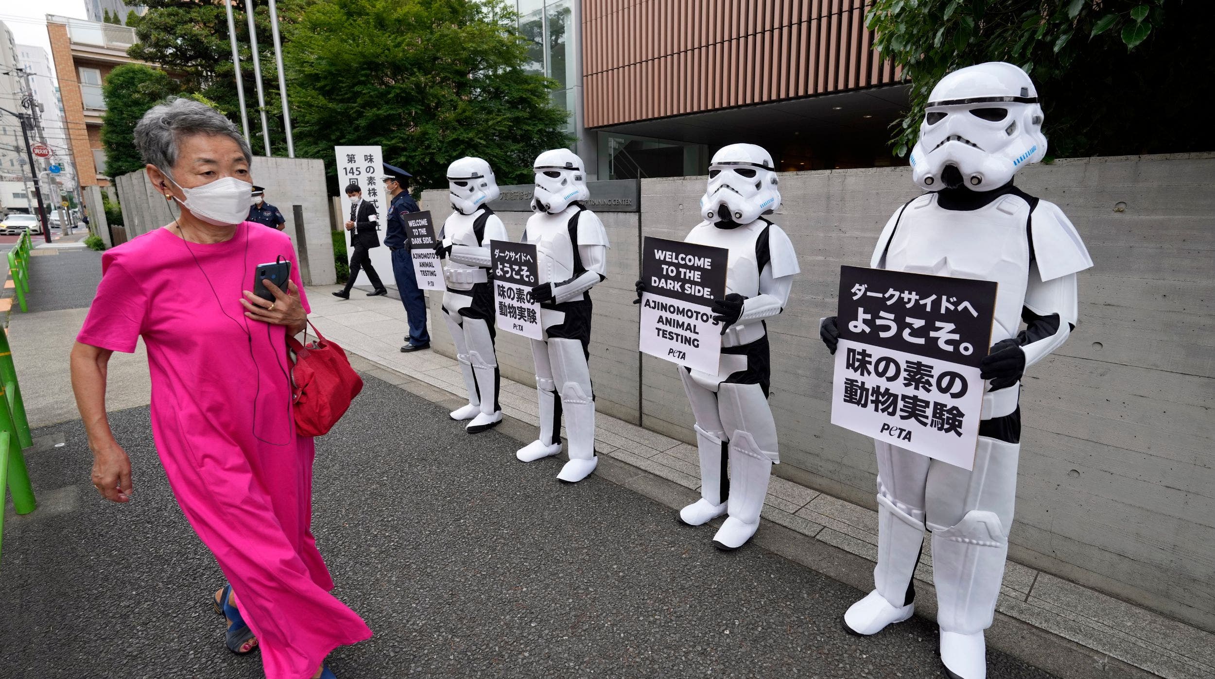 Los activistas a favor de los animales acudieron a la sede vestidos de "stormtroopers", con motivo de la celebración de la junta de accionistas de la empresa, y preguntaron: "¿cuándo seguirá Ajinomoto la tendencia global y abolirá todas las pruebas con animales que no sean exigidas explícitamente por la ley?".