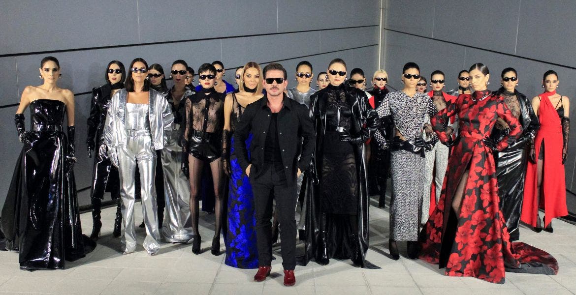 El diseñador, quien ha vestido a actrices y cantantes como Lupita Nyong'o, Rosalía, Cindy Crawford, Nicky Hilton, Thalía, Paz Vega, Mónica Naranjo y Kate del Castillo, apostó por telas de seda estampadas, brocados, charol y piel tanto para las prendas como para los accesorios que van desde guantes, mascadas hasta botas altas y zapatos de vestir.