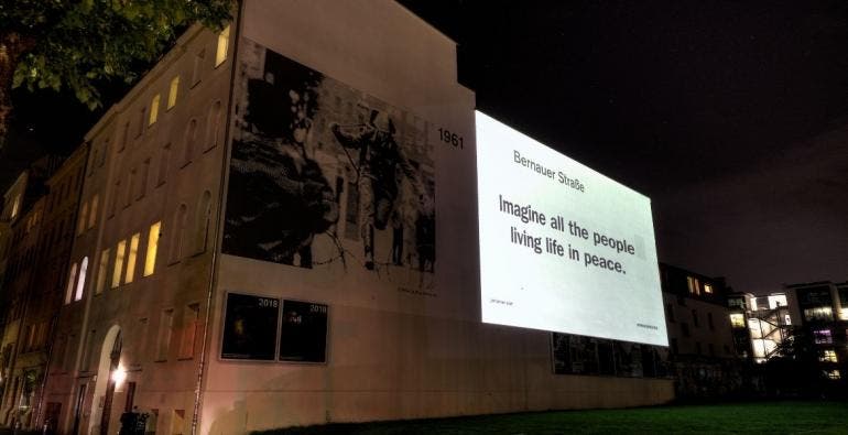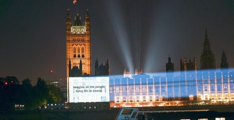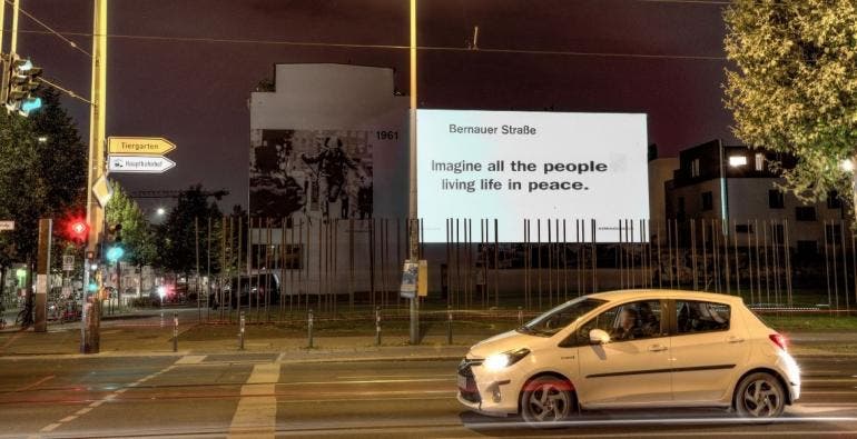 Para conmemorar medio siglo del pacifista tema del exbeatle en varias puntos de Berlín, Londres, Nueva York y Tokio se proyectó la letra de la emblemática canción: "Imagine all the people living life in peace".