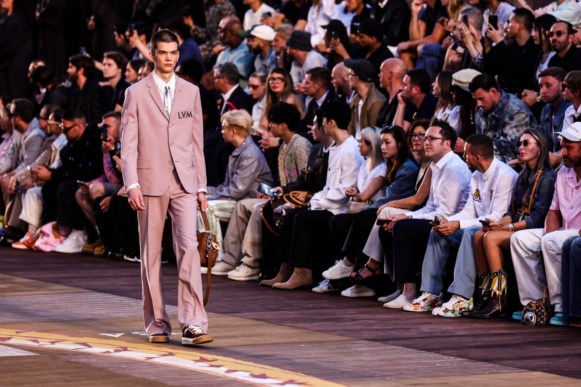 Sobre una pasarela de madera pintada a mano, con escaleras y motivos de serpientes de colores, se apreció una impronta dandi, en abrigos y americanas, en cuyas solapas se leían las iniciales LVM (Louis Vuitton Men).