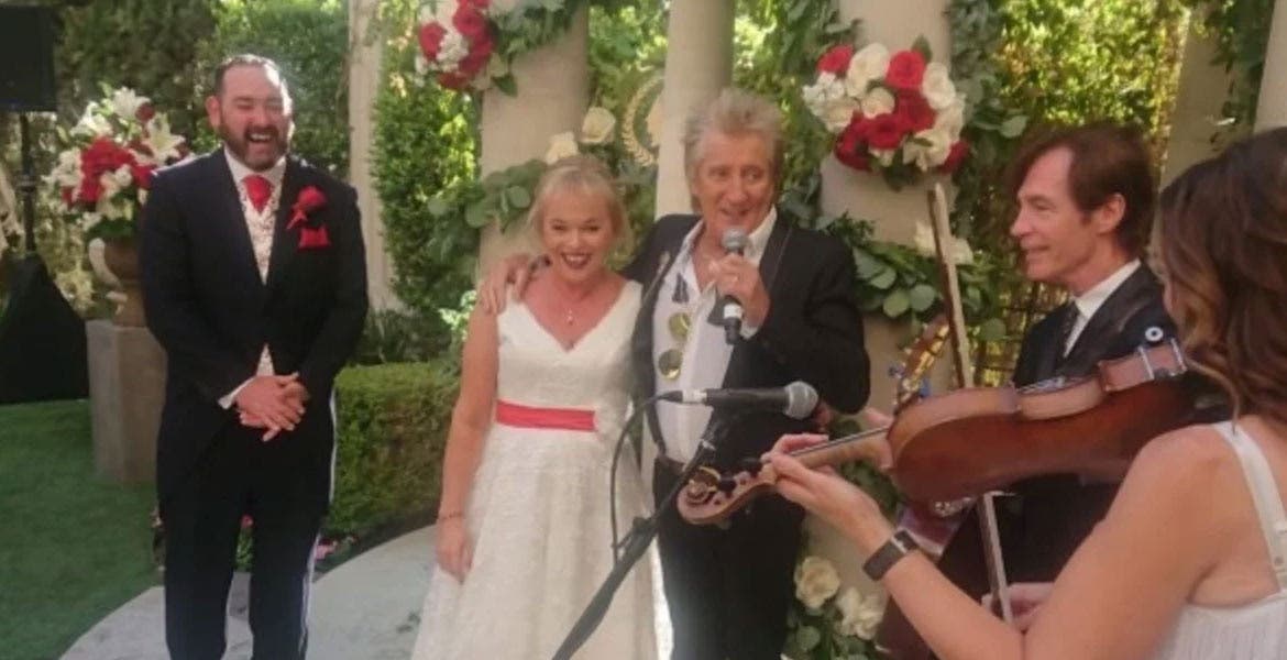 So @rodstewart just turned up at our wedding and sang to my wife! I can’t believe what has happened in the last week and this has just topped it off. Thank you Rod you’ve absolutely made our dream wedding you absolute legend. We Can’t wait to see you Friday #LikeACaesar #SirRod pic.twitter.com/xIv9QmJhnD