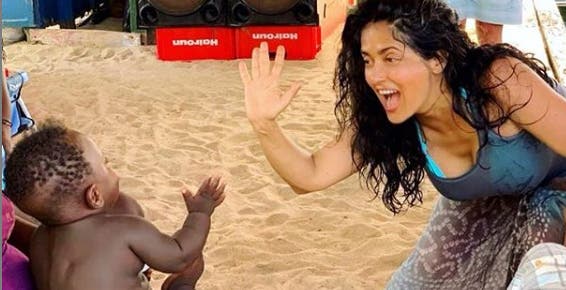 Hayek compartió fotos que la mostraban saludando al pequeño y enviándole besos. Una de las instantáneas que más llamó la atención fue en la que tenía al bebé en sus brazos, con el rostro del pequeño recargado en su pecho, quien hizo un gesto gracioso que se viralizó en redes sociales.