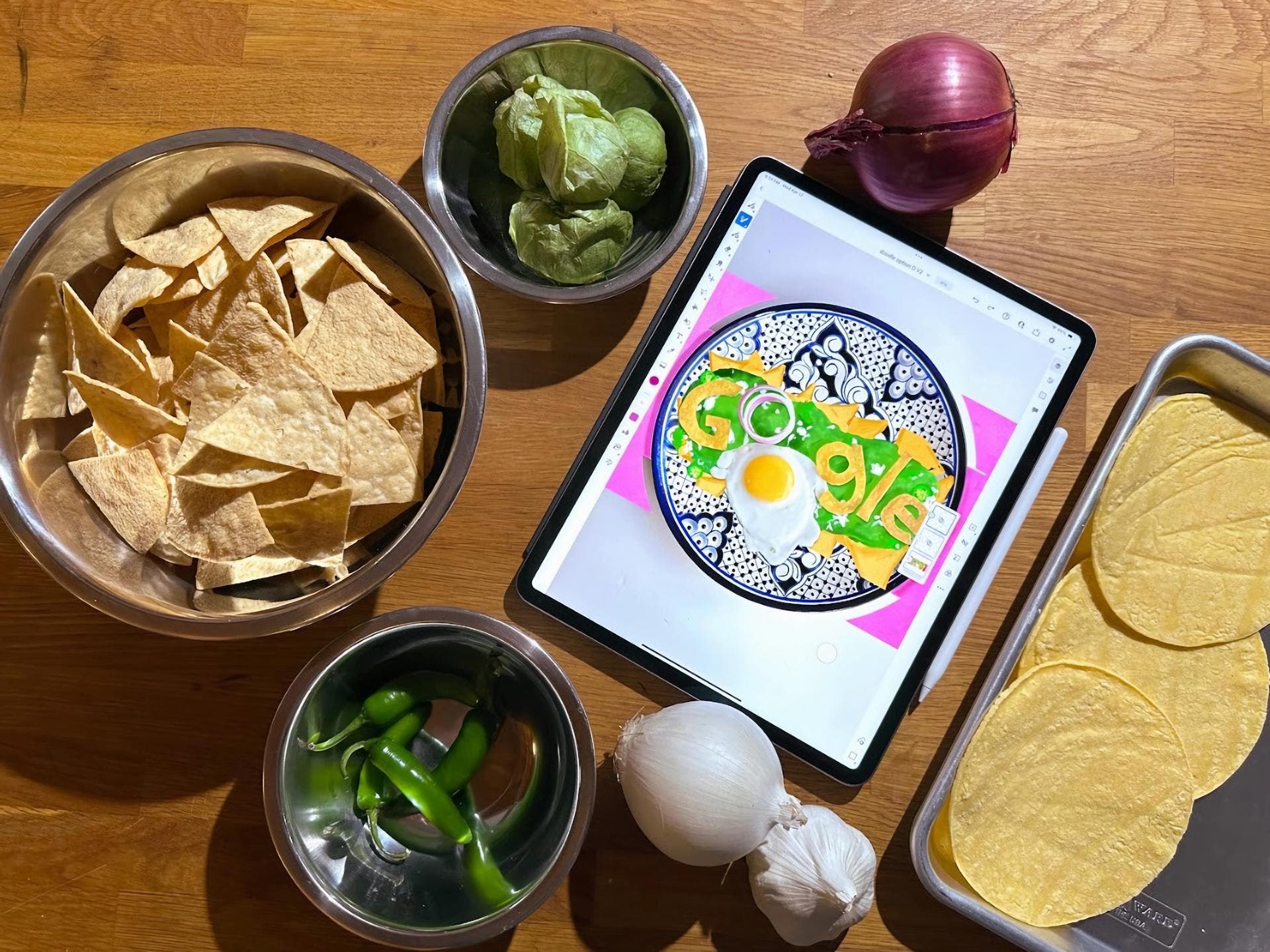 La ilustración muestra, sobre un mantel rosado, un plato blanco de cerámica con diseños en azul, un hexágono compuesto con tortillas, un engarce de chiles verdes, un huevo frito y la palabra Google recortada en tortillas.