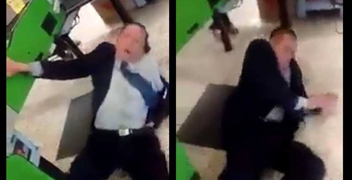 Ya en el piso el hombre comienza a retorcerse como si estuviera teniendo una convulsión y los paquetes robados se logran ver escondidos en su espalda.