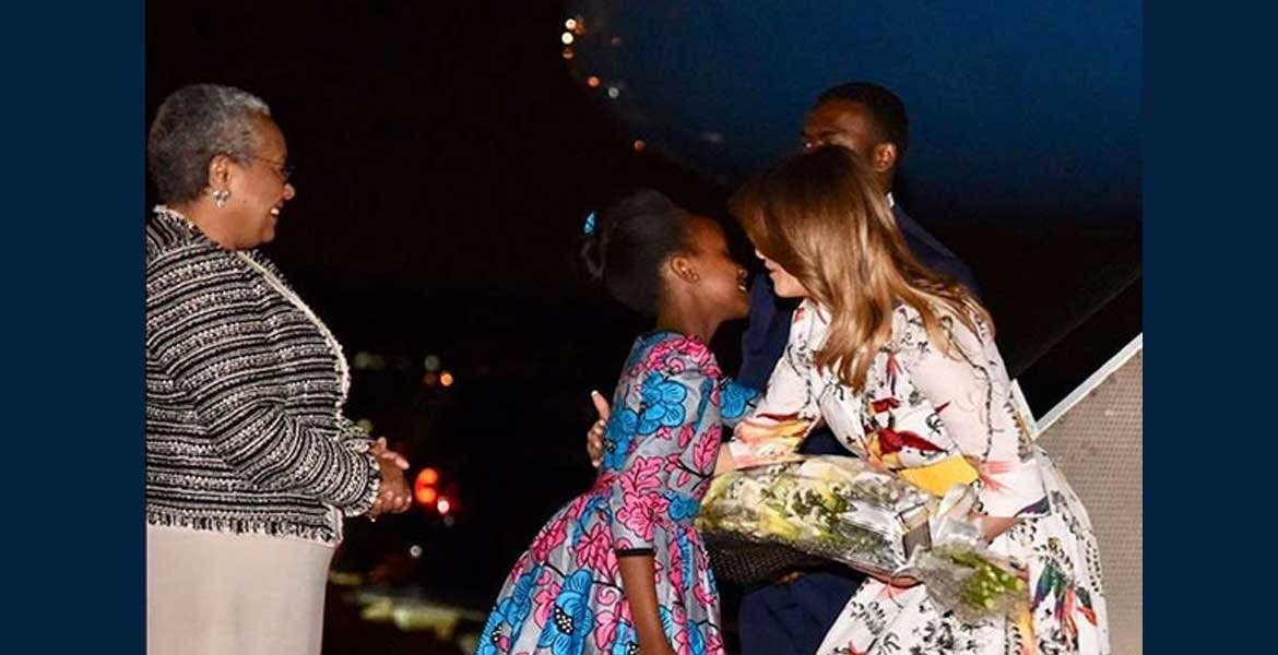 Después de visitar Malawi y Ghana, la esposa del presidente estadunidense Donald Trump llegó la noche de este jueves al Aeropuerto Internacional Jomo Kenyatta, donde fue recibida por la primera dama keniana Margaret Kenyatta y el embajador de Washington en Nairobi, Robert Godec.