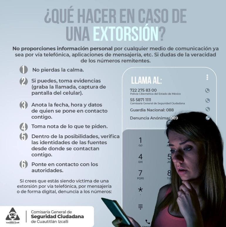 Si llegas a ser víctima de una extorsión, señalan, emplear los siguientes pasos: No perder la calma; si se puede, tomar evidencia (grabar la llamada o realizar captura de pantalla del celular), anotar la fecha, hora y datos de quien se ponga en contacto, tomar nota de lo que piden, intentar verificar las identidades de las fuentes que se contactan y ponrse en contacto con las autoridades pertinentes .