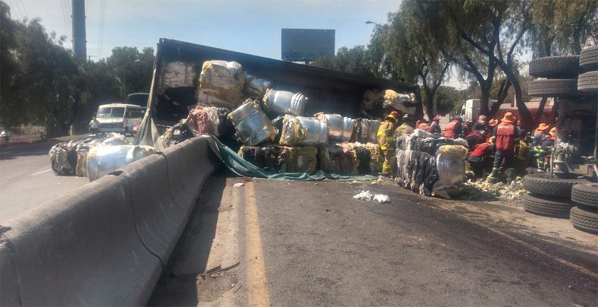 Tlalnepantla.- Personal de la Coordinación Municipal de Protección Civil, Bomberos, Seguridad Pública y Tránsito de Tlalnepantla atendieron la volcadura de un tráiler de doble remolque en avenida Jesús Reyes Heroles a la altura del panteón municipal de Tequexquináhuac.