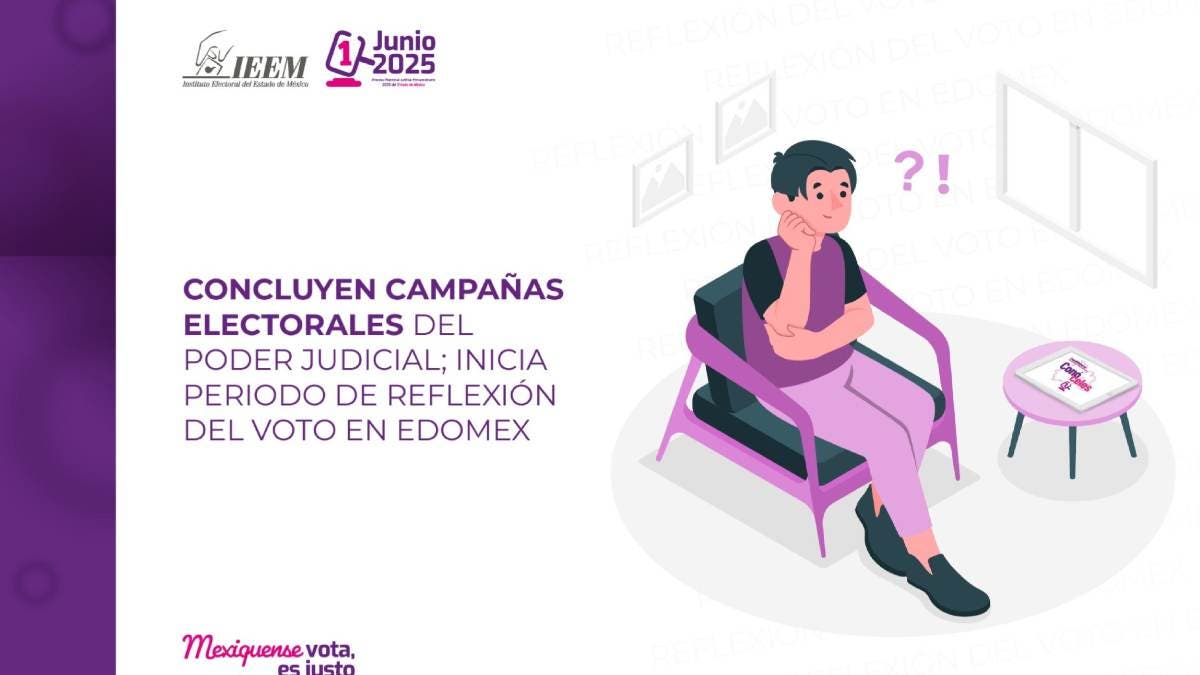 Toluca.- Luego de 35 días, las campañas electorales para ocupar diversos cargos en el Poder Judicial mexiquense llegaron a su fin, por ello, previo a la Jornada Electoral del 1 de junio, hoy inicia el periodo de reflexión de tres días, conocido como veda electoral, momento en que las y los mexiquenses tendrán la posibilidad de continuar analizando las propuestas de las candidaturas a través del Sistema Conóceles.