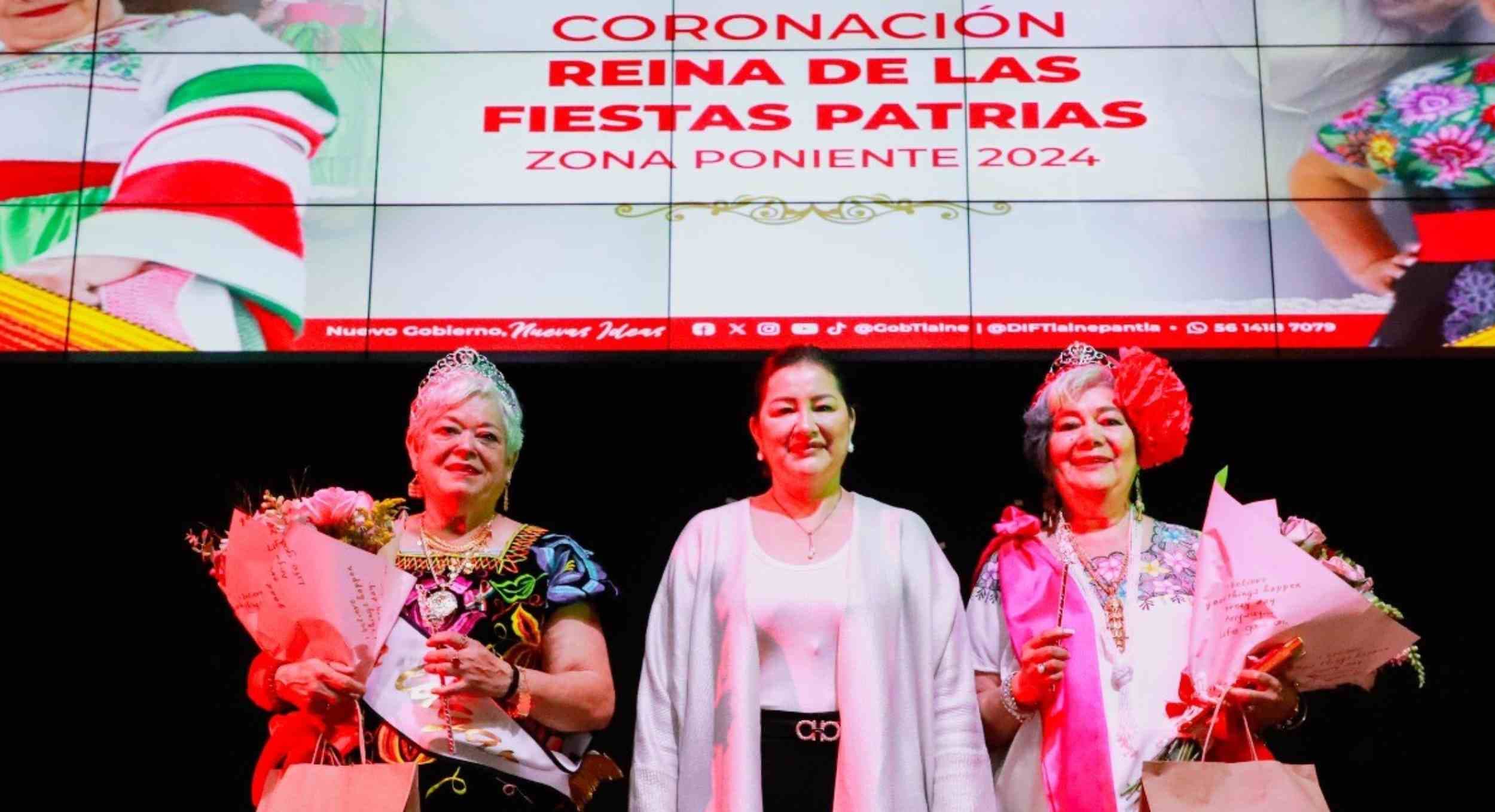 Tlalnepantla.- Para preservar las tradiciones que esta Administración ha promovido entre la población, la presidenta honoraria del Sistema Municipal DIF, Mary Gómez, encabezó la coronación de la Reina de las Fiestas Patrias 2024 de Zona Poniente, distinción que se adjudicó María Inés Elizalde Flores, del grupo de la tercera edad “Alborada”.