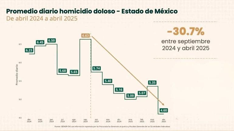 Desde la Mesa de Coordinación para la Construcción de la Paz, se dio seguimiento a este balance, donde, además, se reportó que abril pasado cerró con un promedio de 4.6 homicidios diarios, es decir, dos homicidios menos al día en comparación con el mes de septiembre de 2024, cuando se registraron 6.63 homicidios al día.