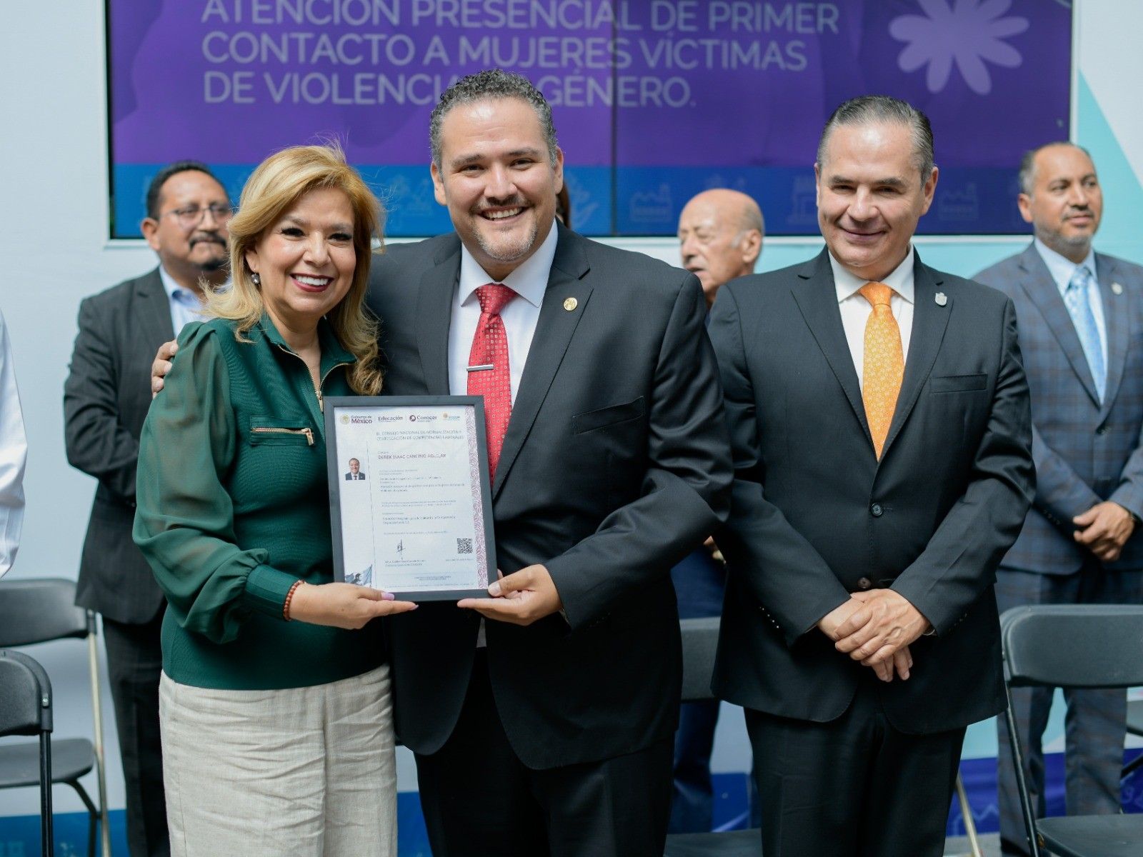 Patricia Arévalo aseguró que en el gobierno que preside Pedro Rodríguez, la violencia de género se combate con capacidad, protocolos claros y un profundo respeto a los derechos humanos de las mujeres. Durante el evento en el que el quinto regidor, Derek Isaac Cancino Aguilar, recibió la certificación EC0539, la presidenta del DIF Municipal reconoció la importancia de la primera atención en situaciones de violencia.