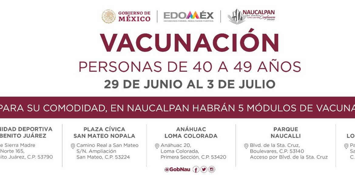 Naucalpan de Juárez.- El martes 29 de junio inicia en Naucalpan la aplicación de la primera dosis de la vacuna contra Covid-19 a las personas de 40 a 49 años. Asimismo, continuará la aplicación de las dosis a mujeres embarazadas mayores de edad con nueve semanas o más de gestación. Los días 29 y 30 de junio, así como 1, 2 y 3 de julio, se inyectará el biológico en cinco módulos distribuidos en el territorio: Deportivo Benito Juárez, Plaza Cívica de San Mateo Nopala, Escuela Primaria “Anáhuac” de Loma Colorada, Parque Naucalli y el Módulo Vehicular de la UVM Lomas Verdes. En un horario de 9:00 a 17:00 horas, personal del Gobierno de México, del Estado de México y de Naucalpan trabajarán en conjunto para la aplicación de las dosis, de acuerdo con la letra inicial del primer apellido: • A, B, C: martes 29 de junio • D, E, F, G: miércoles 30 de junio • H, I, J, K, L, M: jueves 1 de julio • N, Ñ, O, P, Q, R: viernes 2 de julio • S, T, U, V, W, X, Y, Z: sábado 3 de julio Para atender a la población de los pueblos originarios, el sábado 3 de julio se instalarán módulos en San Francisco Chimalpa y Santiago Tepatlaxco, donde se aplicará la vacuna a quien cumpla con el rango de edad, sin importar la letra del primer apellido.