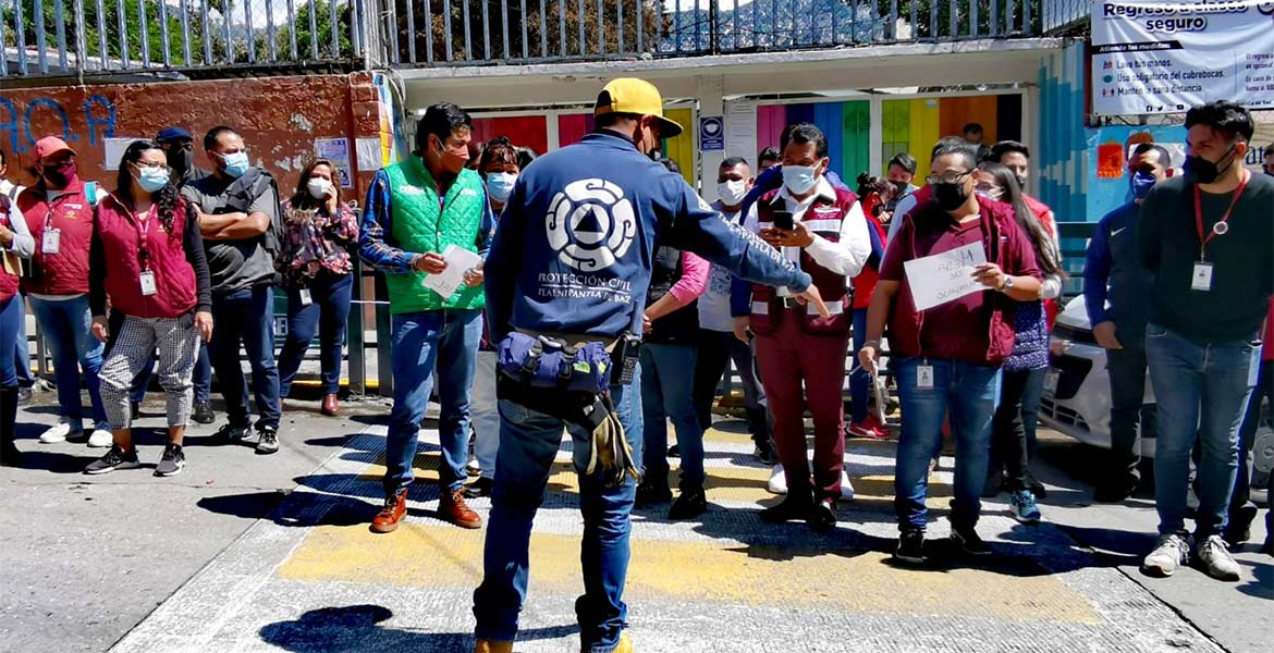 Tlalnepantla.- Servidores públicos de los gobiernos municipal y estatal, vecinas y vecinos participaron en el Segundo Simulacro Nacional 2021, que se realizó en completo orden, sin incidentes y con las medidas sanitarias correspondientes en el ‘Centro de atención a personas afectadas por el deslave del cerro El Chiquihuite’, albergues, plazas comerciales y algunas empresas.