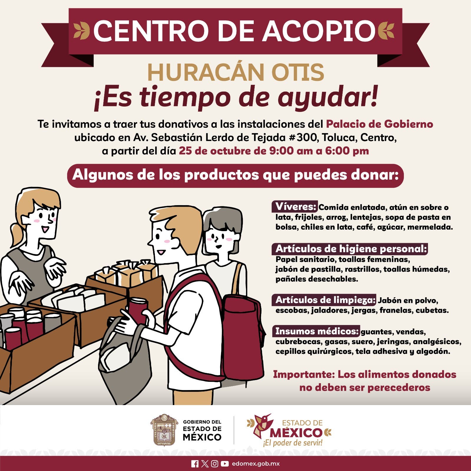 TOLUCA, Estado de México.- En solidaridad con los connacionales damnificados por el paso del huracán Otis, la Maestra Delfina Gómez Álvarez, Gobernadora del Estado de México, solicitó la instalación de un Centro de Acopio en el Palacio de Gobierno en Toluca.