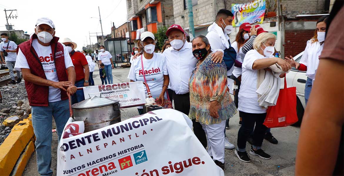 Tlalnepantla.- El candidato a la presidencia municipal de Tlalnepantla por la coalición Juntos Haremos Historia en el Estado de México, Raciel Pérez Cruz, estuvo en San Bartolo Tenayuca y, luego de cerciorarse de que se apliquen las medidas sanitarias para proteger a la gente, les pidió su voto de confianza, para consolidar la transformación de este municipio.