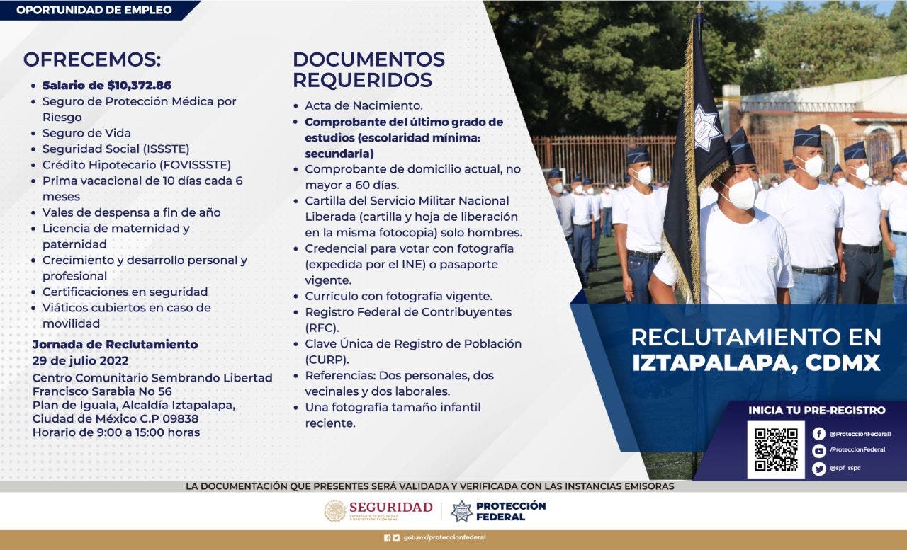 Ciudad de México.- La agencia de empleo Tequicalli de la alcaldía Iztapalapa, lanzó una Jornada de Reclutamiento para formar parte del Servicio de Protección Federal de la Secretaría de Seguridad y Protección Ciudadana (SSPC).