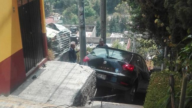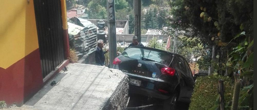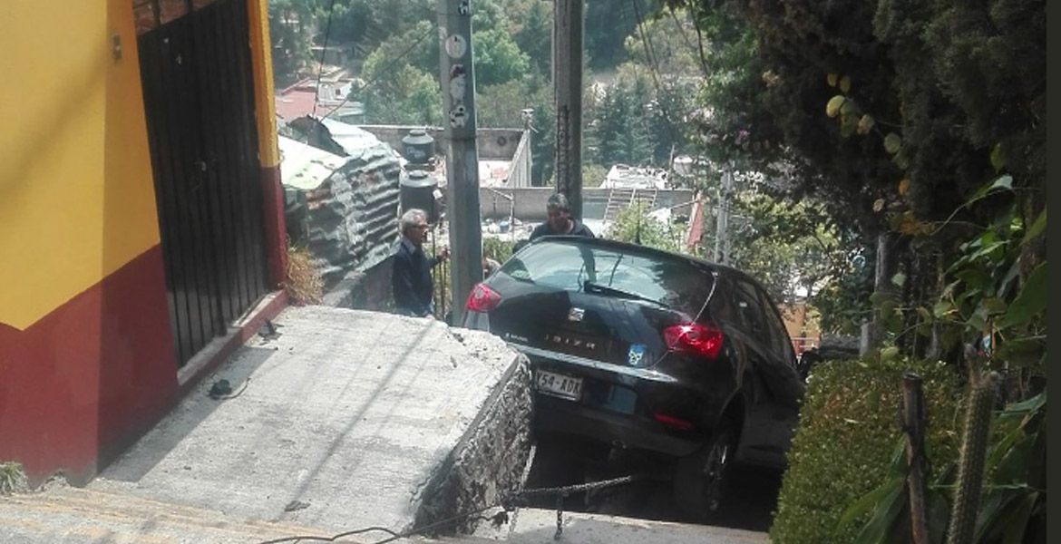 Ciudad de México.-Un auto que se encontraba estacionado en calles de la alcaldía Álvaro Obregón se deslizó por una pendiente y cayó escaleras abajo luego de que el freno de mano, que según el conductor había puesto, fallará.