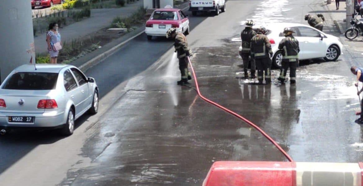 Elementos del Heroico Cuerpo de Bomberos realizaron la limpieza de la cinta asfáltica con agua a presión; tres carriles de la avenida Tláhuac se cerraron para la limpieza, la vialidad se normalizó después de una hora y media por las labores.