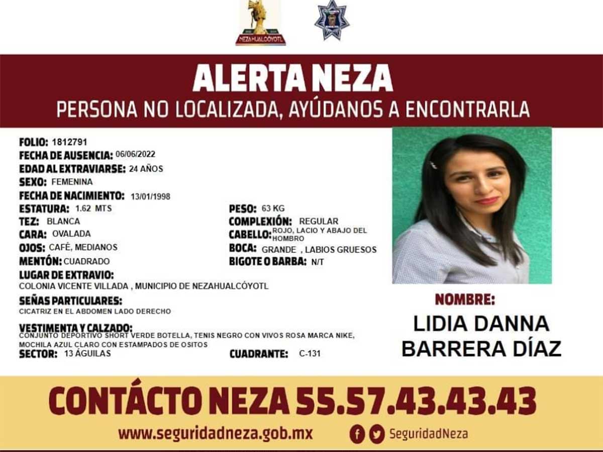 Según la Alerta Neza que emitió el gobierno municipal, Lidia Danna Barrera Diaz, de 24 años, se ausentó de su casa desde el lunes pasado en la colonia Vicente Villada, localizada en Ciudad Neza.
