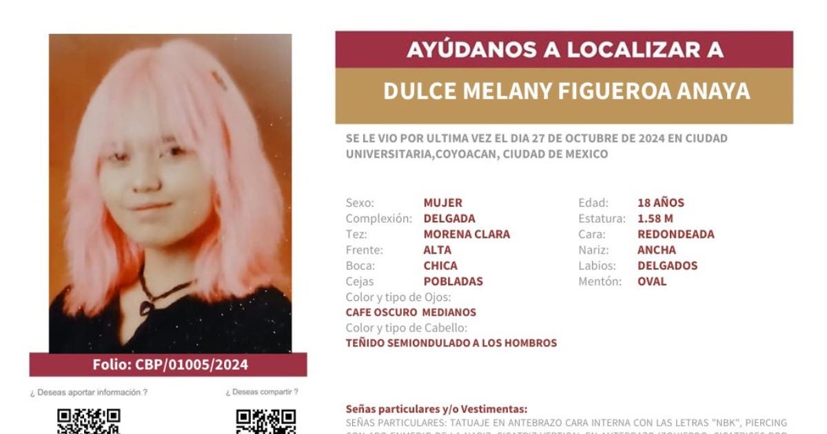 Tras este hecho, la Comisión de Búsqueda de la Ciudad de México señaló en s ficha que Dulce Melany tiene un tatuaje con las letras “NK” en la cara interna del antebrazo, además de una perforación en la nariz, una cicatriz vertical en el antebrazo, cicatrices por acné en el rostro y pecho, y lleva el cabello teñido de rosa.