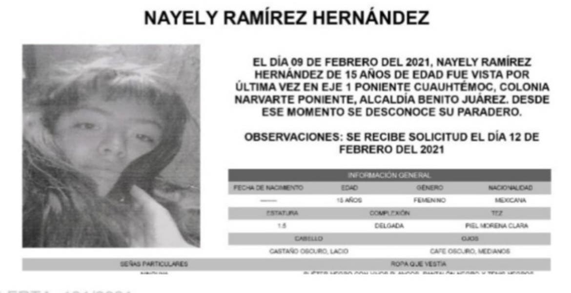 Ciudad de México.- El 9 de febrero pasado, Nayely Ramírez de 15 años fue vista por última vez en la colonia Narvarte Poniente, en la calle Eje 1 Poniente, alcaldía Benito Juárez.