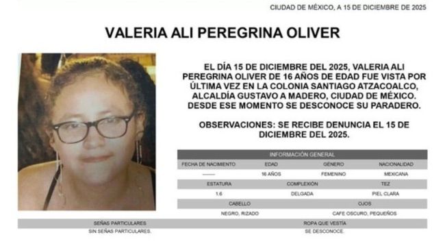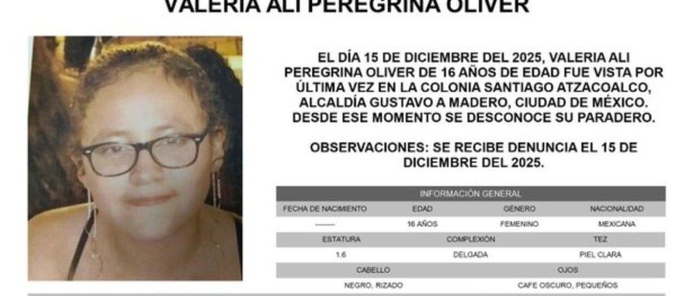 Se activa #AlertaAmber para localizar a Valeria Ali Peregrina Olivar, de 16 años, vista por última vez el pasado 15 de diciembre en la colonia Santiago Atzacoalco, alcaldía Gustavo A. Madero. pic.twitter.com/SgqGuT1Wu2