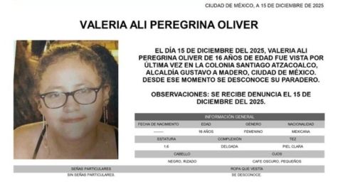 Ciudad de México.- Familiares y seres queridos de Valeria Ali Oliver Peregrina se encuentran consternados luego que la menor de 16 años haya perdido comunicación desde ayer.