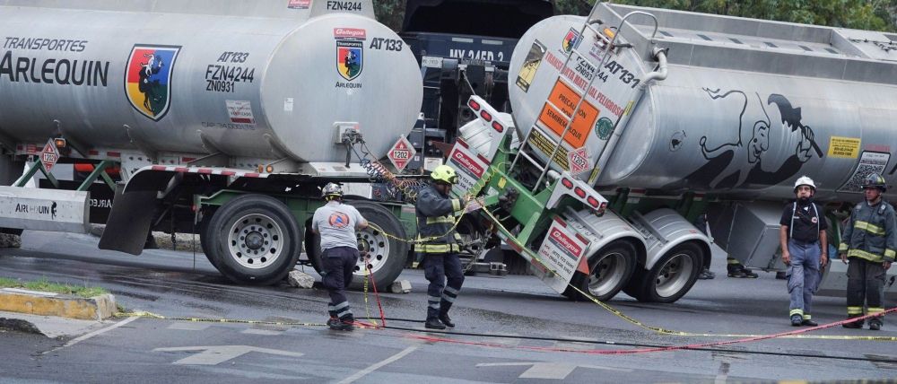 De acuerdo con los primeros reportes, la pipa se volcó parcialmente al tomar una curva, lo que provocó que uno de sus tanques quedara ladeado.