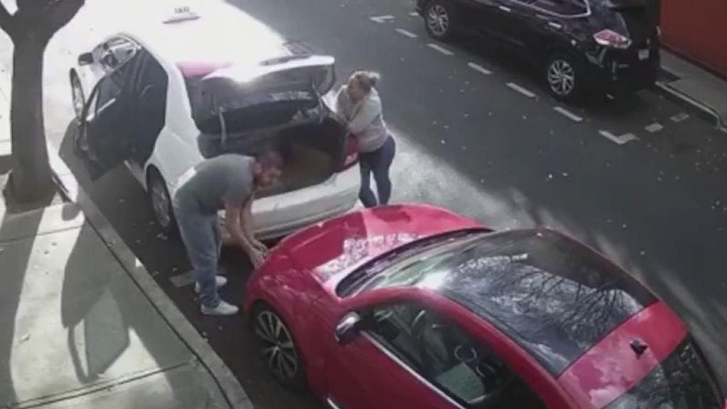Ciudad de México.- En un video que circula en Twitter, que dura apenas 1 minuto 27 segundos se ve al taxista quien es acompañado por una mujer, quien está alerta que sean visto, y en un abrir y cerrar de ojos logra hacerse de los faros del coche de enfrente y rápidamente los mete a su cajuela.