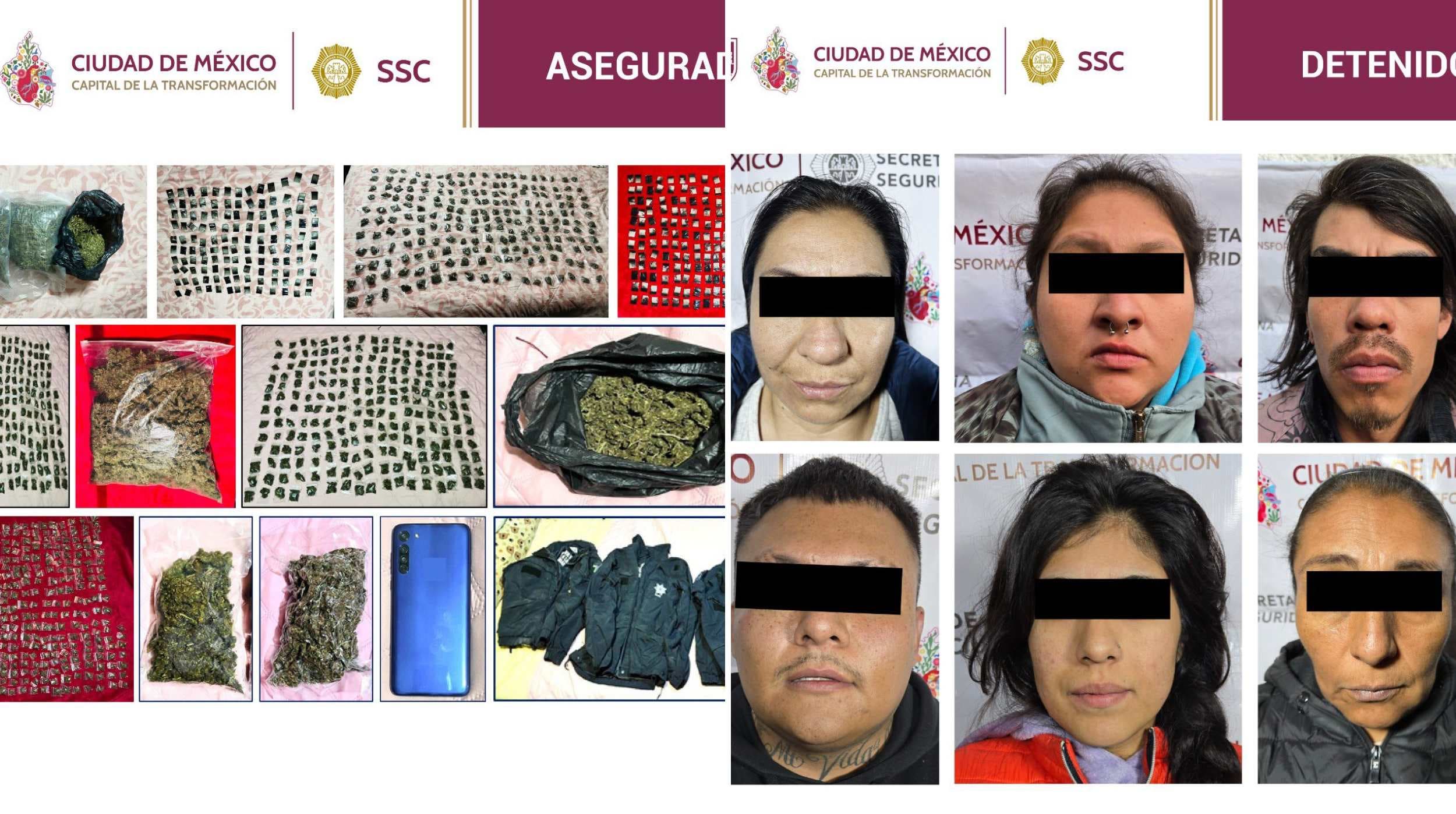 En el primer inmueble, ubicado en Avenida 11, colonia El Vergel, Iztapalapa, se detuvo a un hombre y dos mujeres. En este sitio, los agentes aseguraron 315 dosis de posible cocaína, 216 dosis de aparente marihuana, un kilogramo de marihuana a granel, tres chamarras con insignias de una extinta institución de seguridad federal y un teléfono celular.