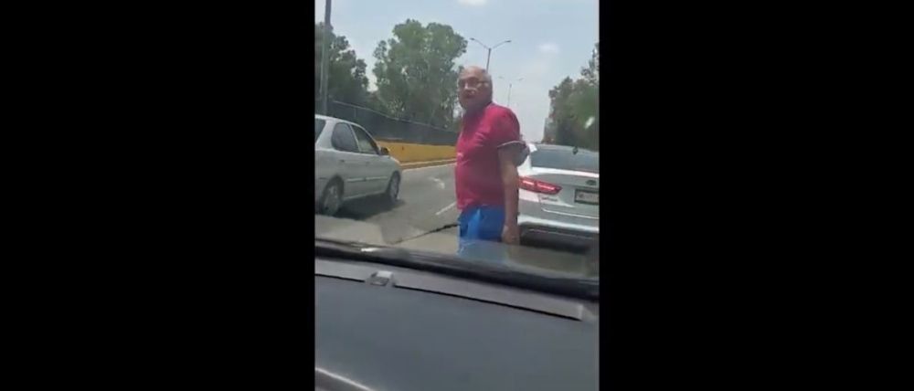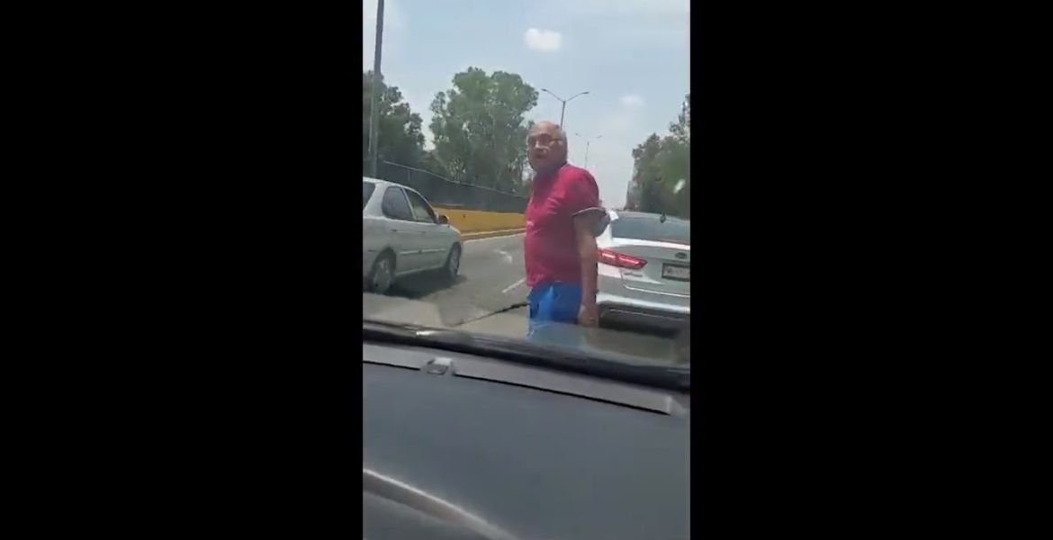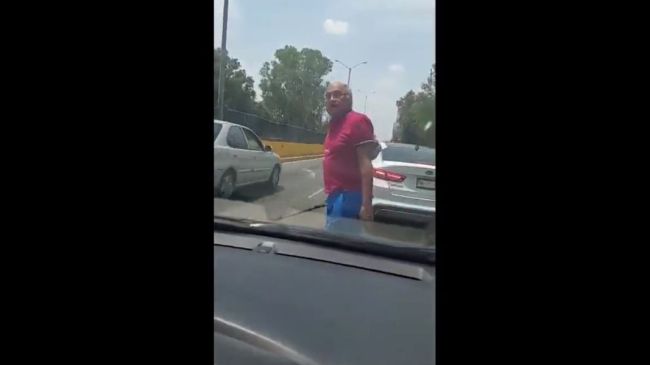 Con base en la grabación, el atacante con pelo canoso, quien porta una playera roja, short azul y lentes, se lanza contra el conductor, quien al parecer viaja con su familia y una menor de edad, quien se encuentra llorando.