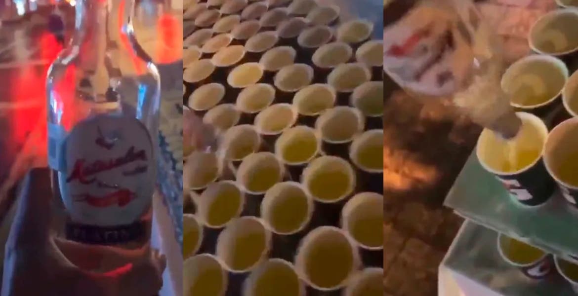 Vía redes sociales circula un video en el que se aprecia a un hombre cómo vierte líquido embriagante en los recipientes que estaban preparados para los competidores.