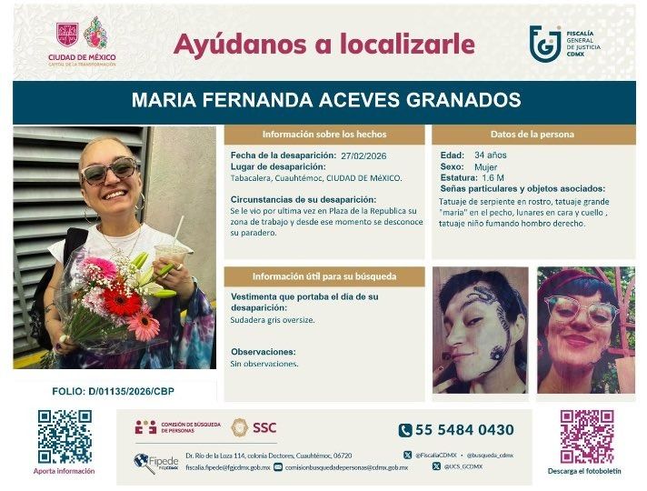 Ciudad de México.- La Fiscalía General de Justicia de la Ciudad de México (FGJCDMX) inició los protocolos de búsqueda para localizar a María Fernanda Aceves Granados, quien desapareció en inmediaciones del Monumento a la Revolución.